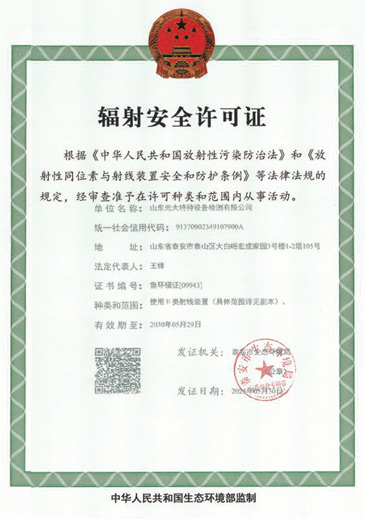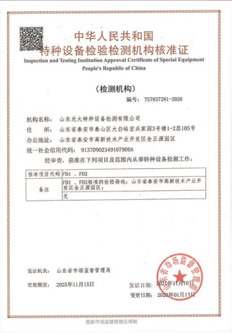 山東光大特種設(shè)備檢測有限公司是經(jīng)山東省市場監(jiān)督管理局核準(zhǔn)的甲類B1特種設(shè)備綜合檢驗機構(gòu)。2017年9月30日取得了山東省市場監(jiān)督管理局頒發(fā)的《檢驗檢測機構(gòu)資質(zhì)認定證書》。2018年2月22日取得了山東省市場監(jiān)督管理局頒發(fā)的《特種設(shè)備檢驗檢測機構(gòu)核準(zhǔn)證》(起重機械)檢驗檢測資質(zhì)。2021年11月取得山東省市場監(jiān)督管理局版發(fā)的《特種設(shè)備檢驗檢測機構(gòu)核準(zhǔn)證》(安全閥在線、離線)校驗資質(zhì)。2023年11月取得山東省市場監(jiān)督管理局頒發(fā)的甲類檢驗機構(gòu)B1《特種設(shè)備檢驗檢測機構(gòu)核準(zhǔn)證》,具有壓力容器(RD2...